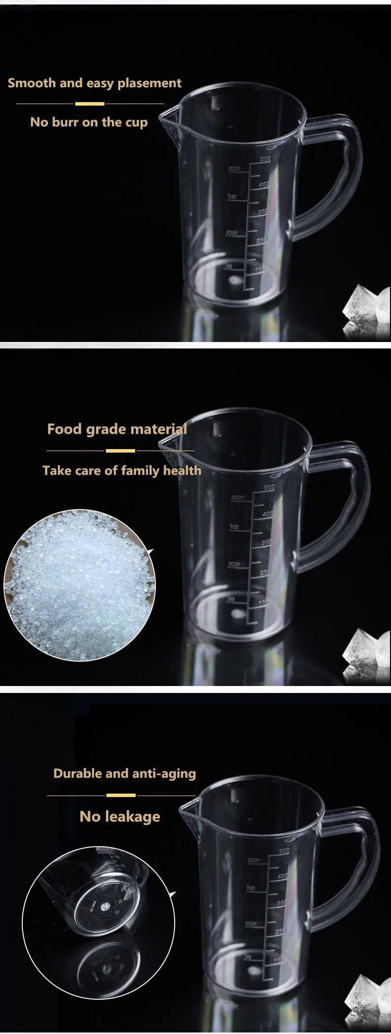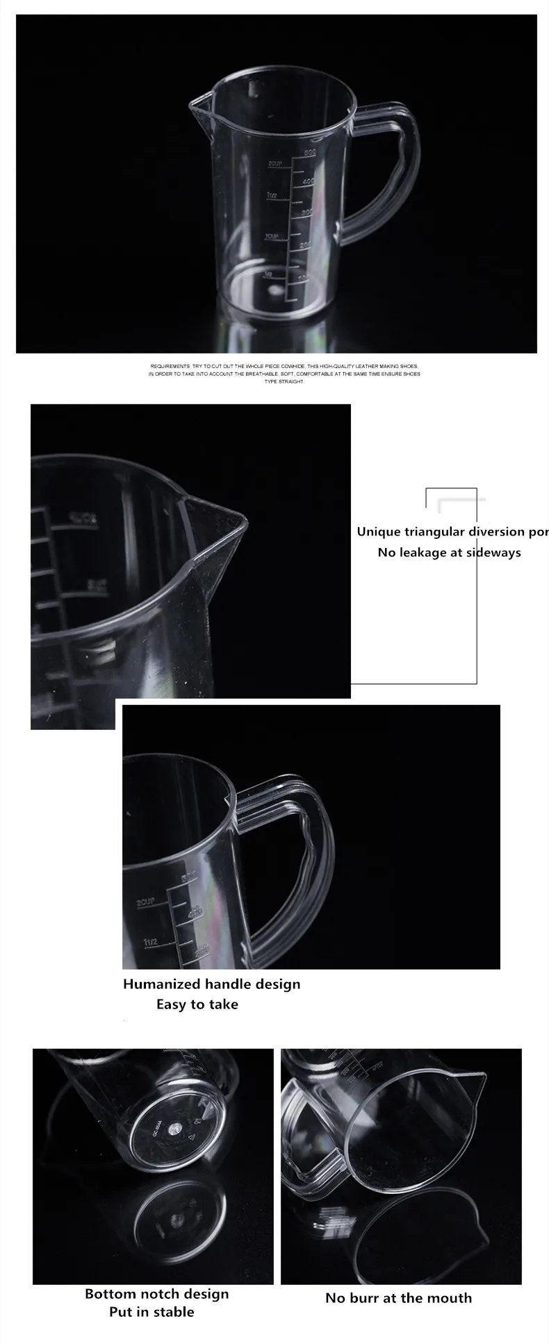| Specifications: 2. Durable, chemical resistance 3. With clear and accurate graduation, size, burr-free 4. Can't be on the heating plank usage 5.Volume:500ml,1000ml,2000ml,3000ml |