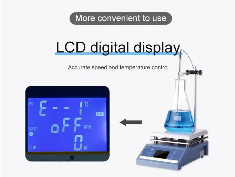 sensor can control precisely the temperature of heated liquid.The inside K sensor can control the temperature of hotplate. - One key to shift inside and outside sensor,easy to operate and control precisely. 10.Large screen LCD display can indicate