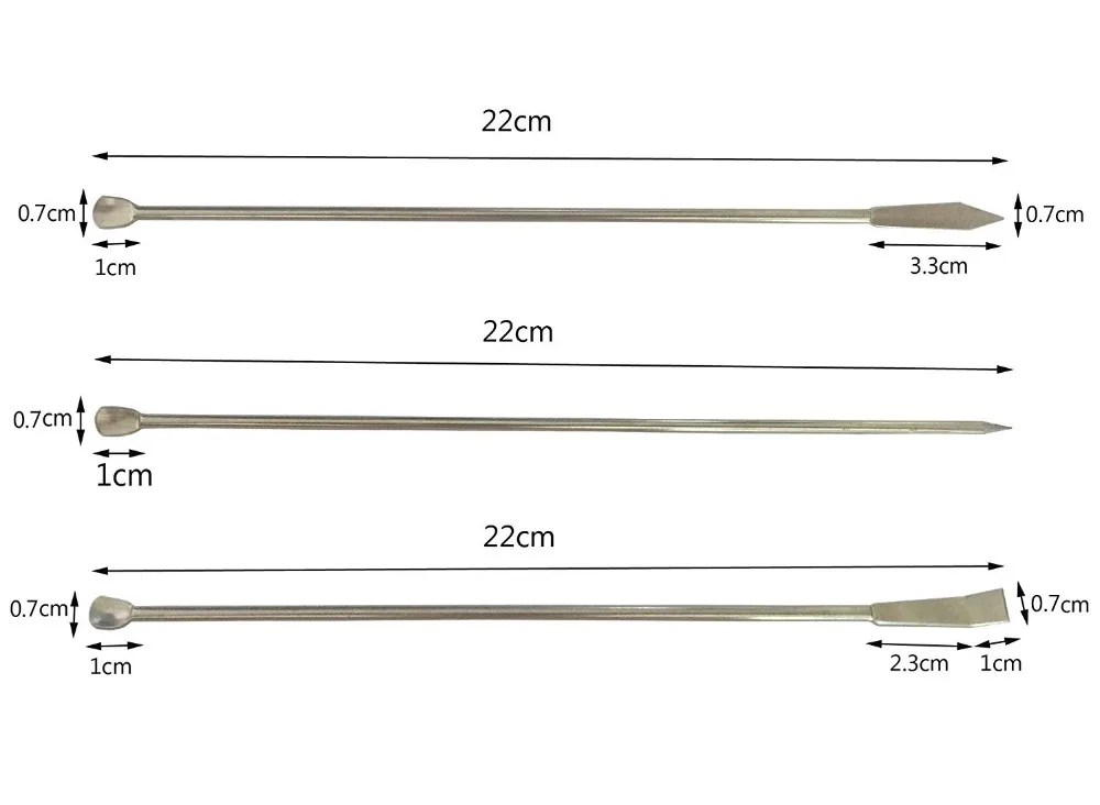 | Product description Package include:Three different specifications Sampling Spoons 1.Overall length:22.5cm 2.Easily stir in deep containers while mixing ingredients together. 3.Home, science,specialty spoons set,great for deep cups |